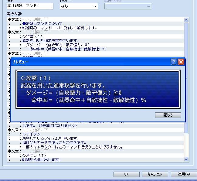 今回一番やりたかった、戦闘中の行動選択時に敵味方の能力値を比較できるシステム。これは、プレイヤーがダメージ計算式を知っているという前提が無ければ十分に活かされないものなんです。